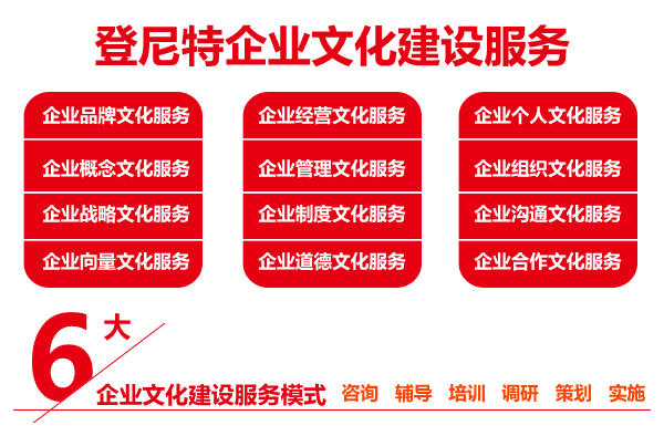 登尼特企业文化建设服务包括:企业品牌文化建设服务、企业概念文化建设服务、企业战略文化建设服务、企业向量文化建设服务、企业经营文化建设服务、企业管理文化建设服务、企业制度文化建设服务、企业道德文化建设服务、企业个人文化建设服务、企业组织文化建设服务、企业沟通文化建设服务、企业合作文化建设服务。